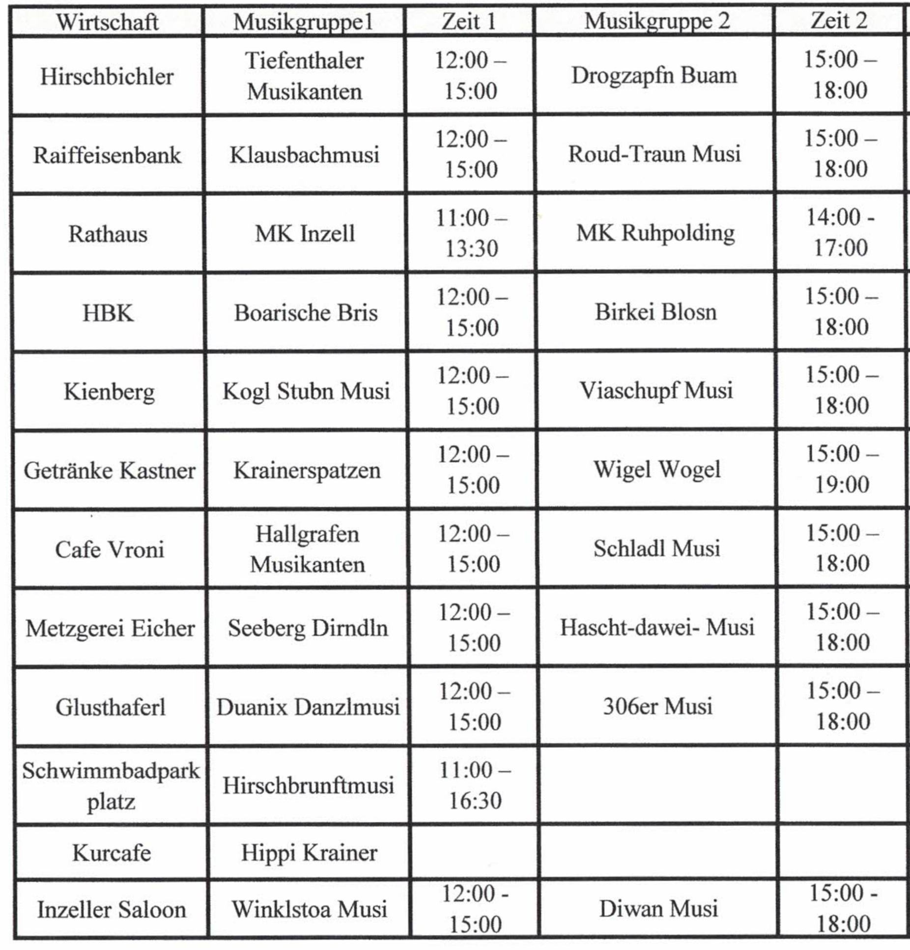 Übersicht Pfingstroas 2026 Kogl Stubn Musi Musikkapelle Inzell Kessel-Alm Musi Klausbachmusi/Vogelfrei Musi Hippi Krainer Hirschbrunftmusi Hallgrafen Musikanten Birkei Blosn Drogzapfn Buam Alpensound 306er Musi Alpenblick Quintett Zwiesler Buam Wigel Wogel Zweng da Musi Tiefenthaler Musikanten Viaschupf Musi Seeberg Dirndln Schladl Musi SchöScha Musi D’Rauschberger Musi Ruhpolding